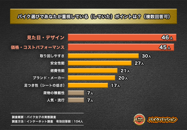 - 女性がバイク選びで重視するポイント『見た目・デザイン』が最多の回答に!『価格・コストパフォーマンス』が続く