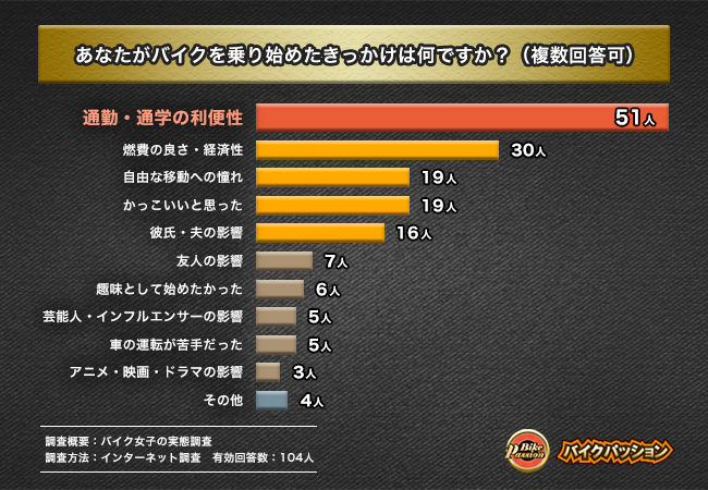 次に「あなたがバイクを乗り始めたきっかけは何ですか?」と質問したところ、『通勤・通学の利便性』(51人)が最多となりました。約2人に1人と多くの女性が、実用的な理由でバイクを選んでいることが明らかになりました。