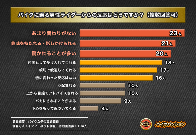 - 男性ライダーからの反応『あまり関わりがない』が23人で最多の回答に!続いて『興味を持たれる・話しかけられる』