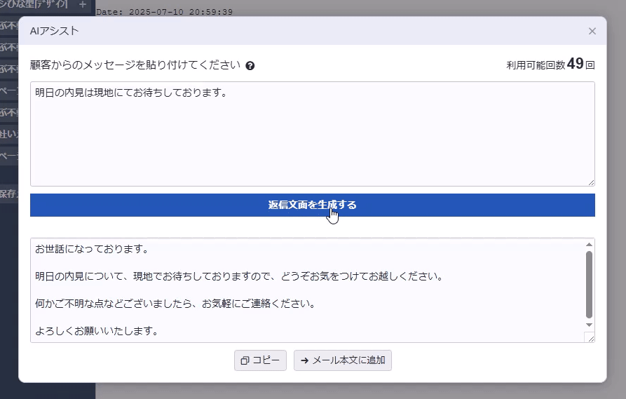 顧客管理機能(CRM)内の「AI返信」を利用し、受信した内容をペーストするだけで、適切な返答文が自動生成されます。