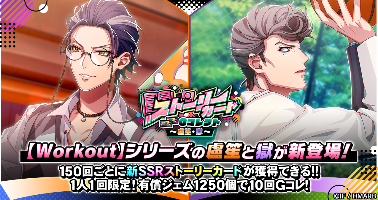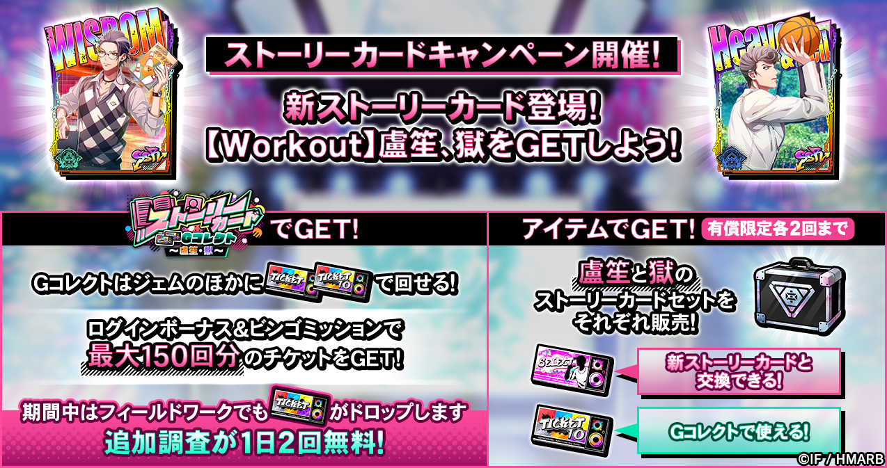 新ストーリーカード「SSR【Workout】躑躅森盧笙」と「SSR【Workout】天国獄」を獲得することができるGコレクトを開催しています。Gコレクトはジェムのほか、専用チケット「ストーリーGコレチケット(vol.1)」各種を使うことでも回すことができ、ビンゴミッションとログインボーナスで最大150回分のチケットを獲得できます。