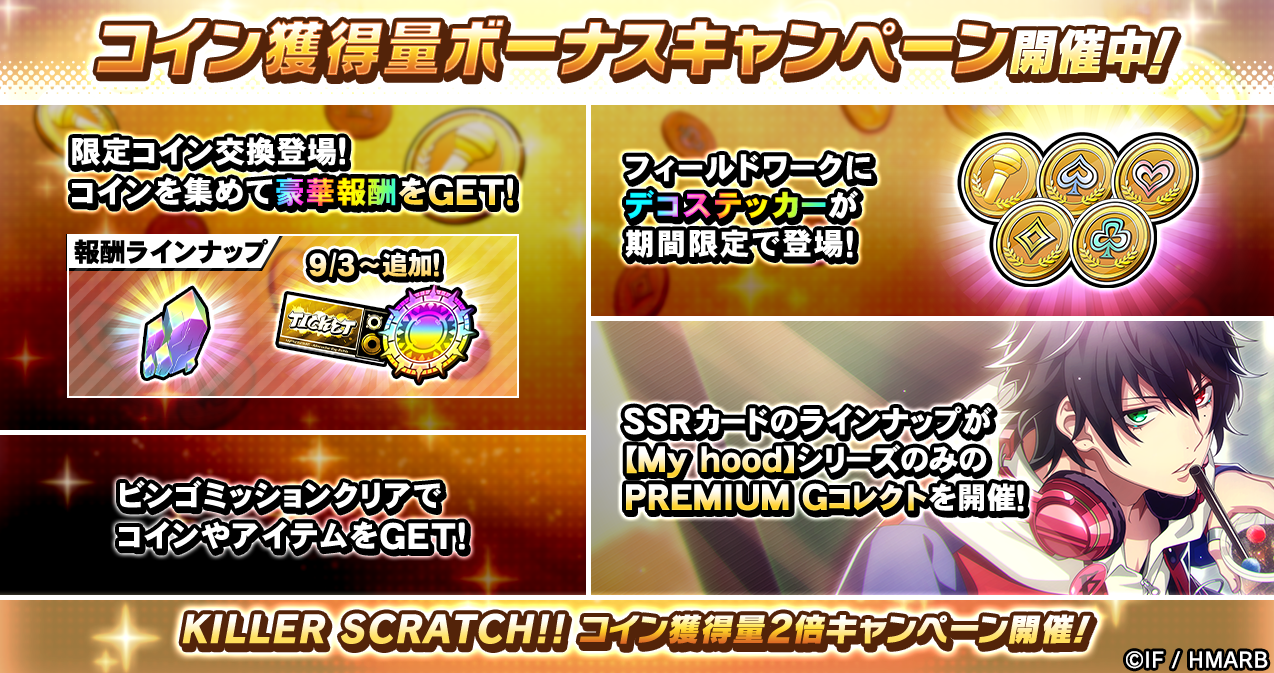 「スキルスターマテリアル:SSR」など豪華アイテムと交換できる限定コイン交換をはじめ、ビンゴミッションやログインボーナス、KILLER SCRATCH!!をプレイした際のコイン獲得量が2倍になるキャンペーンなどを開催しています。詳細はアプリ内お知らせをご確認ください。