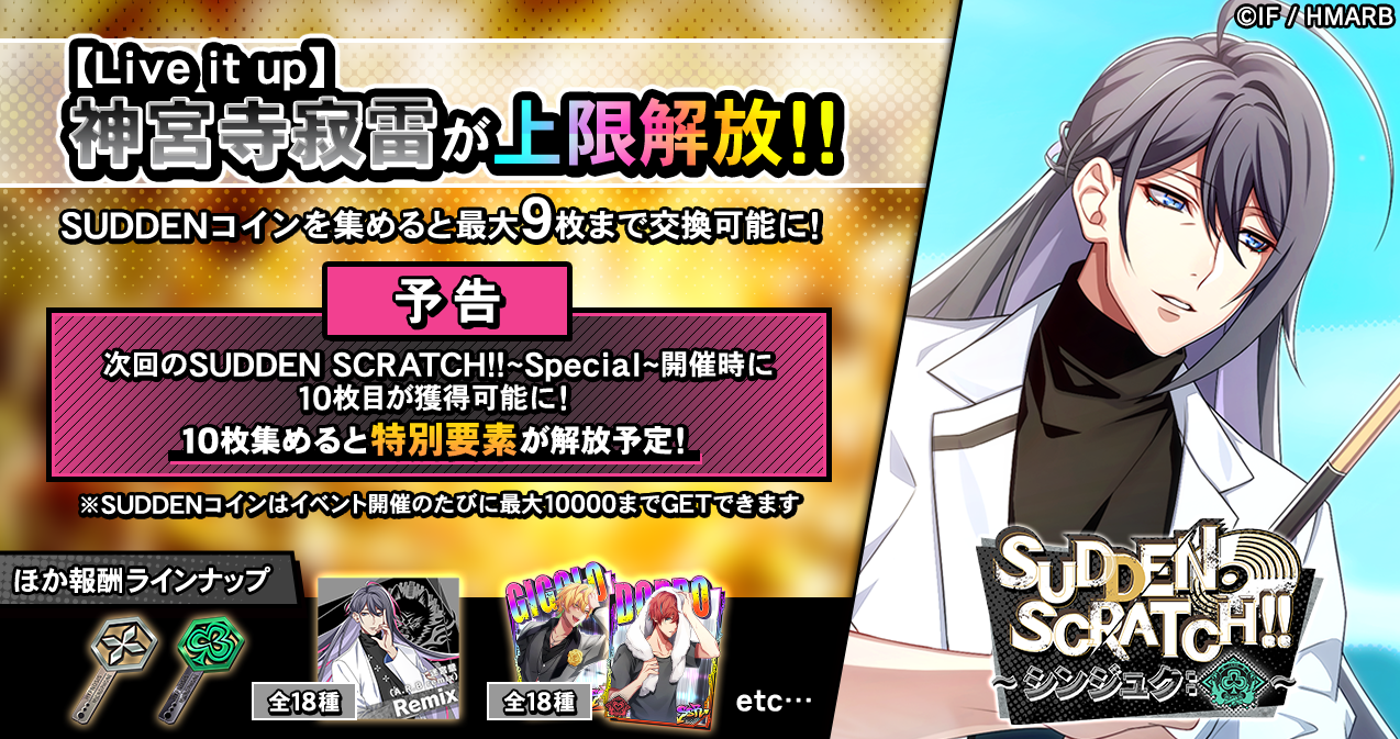イベント期間中、KILLER SCRATCH!!をプレイするとライズ消費量に応じた確率でSUDDEN SCRATCH!!が発生します。SUDDEN SCRATCH!!をプレイすると、通常の報酬アイテムの他、限定アイテム「SUDDENコイン」を獲得することができます。「SUDDENコイン」を集めることで、「A.R.B remix」楽曲やレイズキー、シンジュク・ディビジョンのデコステッカーに使えるブースターなどと交換することが可能です。また、ストーリーカード「SSR【Live it up】神宮寺寂雷」が上限解放され、最大9枚まで獲得できます。詳細はアプリ内お知らせをご確認ください。