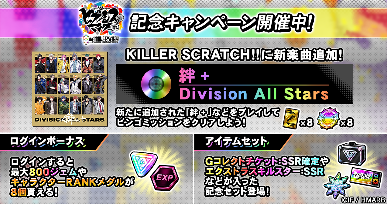 原作プロジェクト「ヒプノシスマイク -Division Rap Battle-」の8周年を記念したキャンペーンを開催いたします。8周年を記念して、ストリーミング配信が開始された楽曲「絆 +」をKILLER SCRATCH!!にも追加!その他にも、ビンゴミッションや7日間のログインで800ジェムなどを獲得できるログインボーナス、記念アイテムセットの販売を実施しています。詳細はアプリ内お知らせをご確認ください。