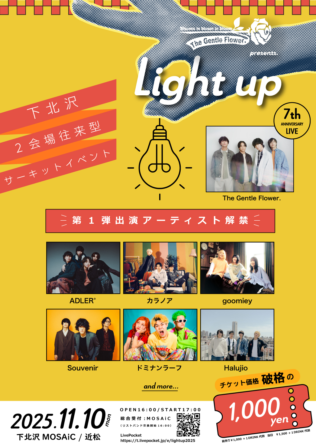 「Light up」は2019年からThe Gentle Flower.が不定期で開催している自主企画イベントで、今回で10回目の開催を迎える。「地元群馬の音楽シーンに光を」というコンセプトで群馬県内での開催を重ねて来た。
