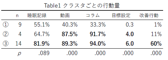 参加者のプログラム中の行動量に基づき、以下の3クラスタに分類しました。(Table1)