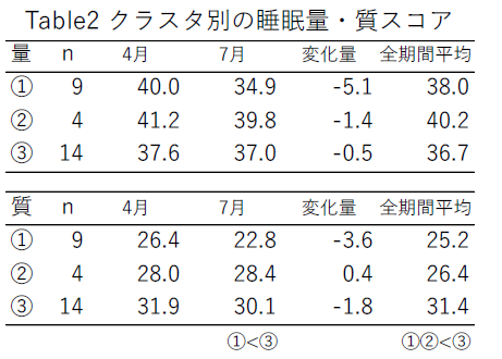 各クラスタ間の平均睡眠スコア(量・質)と、開始月→終了月の変化量を比較した結果、平均睡眠量スコアにおいてはクラスタ間で有意な差がみられませんでしたが、平均睡眠質スコアは、「アクティブ群」が高く維持されました。また、開始月はクラスタ間で有意差がなかったものの、終了月は「非アクティブ群」の睡眠質スコアが有意に低下していました。(Table2)