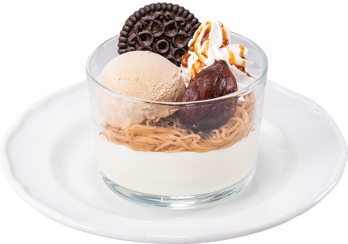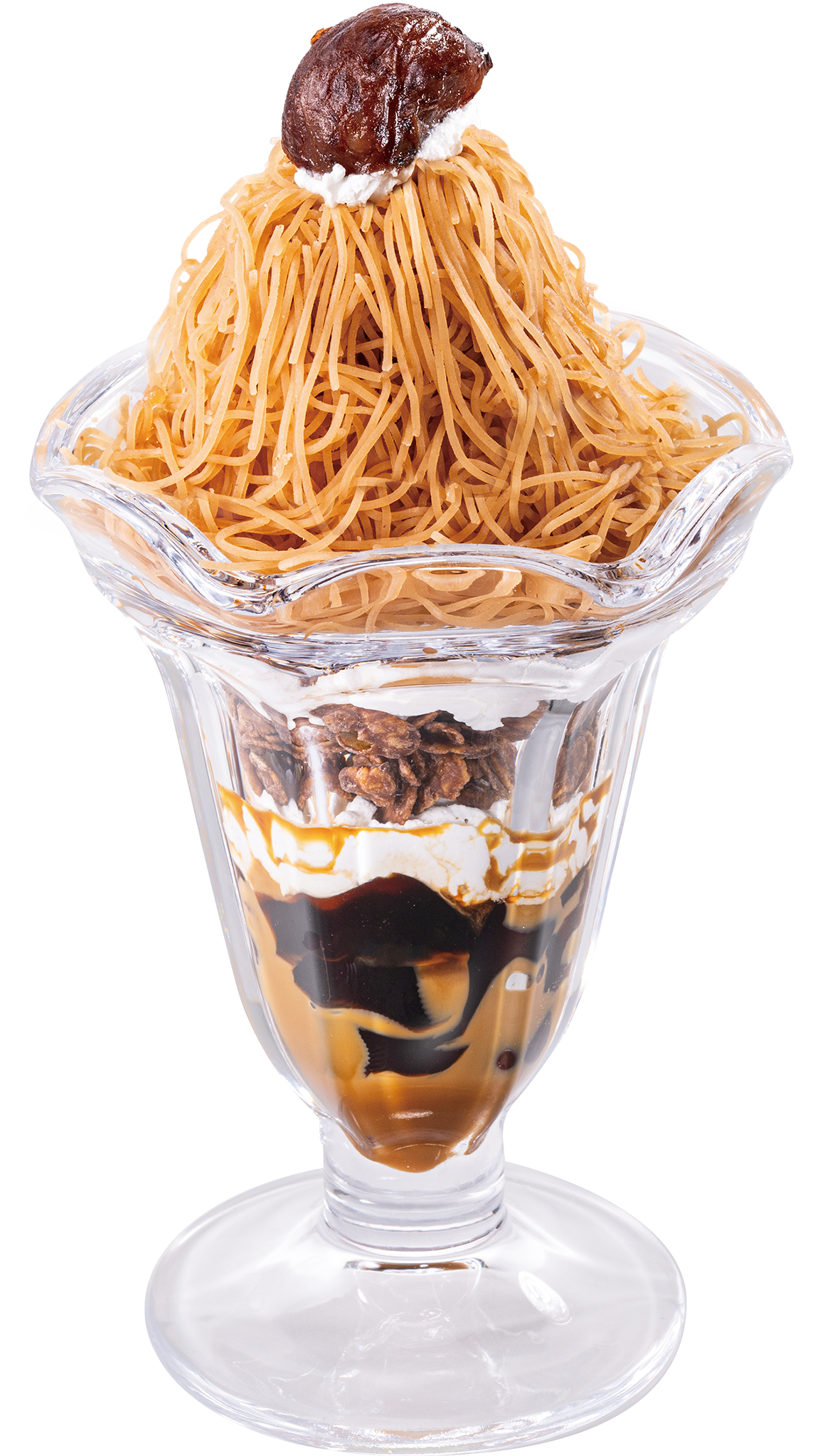 イタリア産の栗を使用したマロンペーストを、たっぷりとしぼったパフェです。マロンペーストの豊かな風味や渋皮栗の上品な甘みを、ひんやり爽やかなバニラジェラートが引き立てます。ザクザクのチョコフレークや、ビターキャラメルソースを合わせたプルプル食感のコーヒーゼリーなどを重ね、食感の変化も楽しいパフェに仕立てました。甘さとほろ苦さのバランスが絶妙な、秋の訪れを感じるドルチェをご堪能ください。