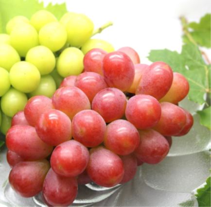 • 鮮やかな赤色の美しい外観と、種なしで皮ごと食べられる手軽さが特徴。マスカットの香りが非常に強く、糖度19度程度の際立つ甘さを持ちます。シャインマスカットの華やかな香りと甘さを引き継ぎながら、赤い色彩を実現した革新的な品種です。