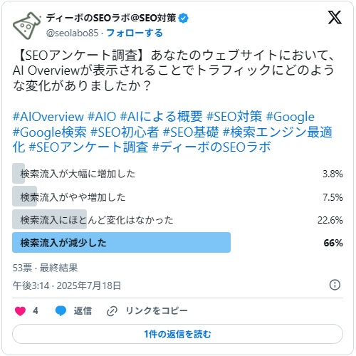 本調査は、ディーボが運営する「SEOラボ」の公式Xアカウント(@seolabo85)にて、2025年7月7月18日~28日の期間、「AI Overview」に関する6つのアンケート調査を実施しました。