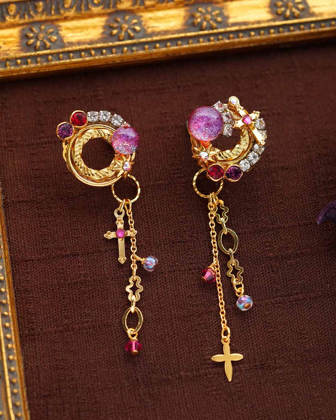 ハロウィンの夜に現れる“赤の女王”をイメージした、絢爛豪華でミステリアスなデザイン。煌めくジルコニアはティアラの輝き、鮮やかな赤いガラスは“赤の女王”がまとうドレスの色。アシンメトリーで妖しくも華やかなデザインが目を惹く、ハロウィンコーデの主役になってくれそうなアイテムです。