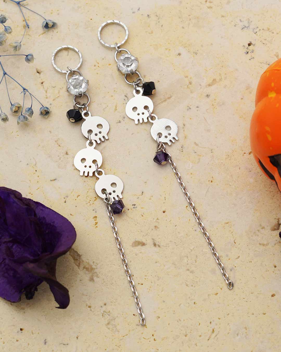 ハロウィンの夜に、冥府からの使者が舞うように夜空を飛ぶ様子をイメージしたカスタマイズチェーン。ドクロモチーフと煌めくビジューを組み合わせた、ダークでどこかコミカルな雰囲気漂うデザインです。
