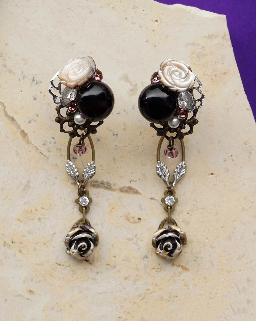 バラのドレスをまとったアンティークの美しいフランス人形やドールハウスをイメージしたデザイン。黒のガラスにクラシカルなバラやアンティーク調のモチーフを合わせ、時を超えて愛される芸術品のような佇まいに仕上げました。チェーンが外せる2WAYデザインなので、クラシカルな装いにはもちろん、普段のコーディネートにも。