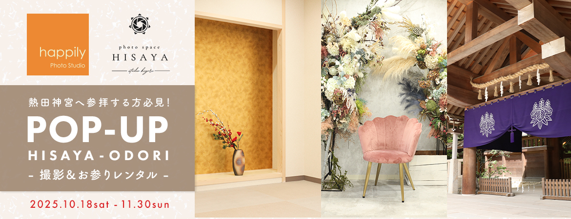 子どもの成長を祝う七五三。その大切な一日を、もっと便利に、もっと心に残る時間に。 子ども・ファミリー向けフォトスタジオを全国展開する株式会社ハピリィ(本社:東京都港区、代表取締役:二口恵子、以下「ハピリィ」)は、初めて熱田神宮近くにPOPUPスタジオを展開します。 東京・表参道「アニヴェルセル表参道」での好評企画に続き、今回は名古屋・久屋大通の「photo space HISAYA」にて、撮影・着付け・ヘアメイク・参拝をワンストップで提供。ご家族に安心で快適な七五三の新しい体験をお届けします。