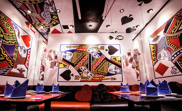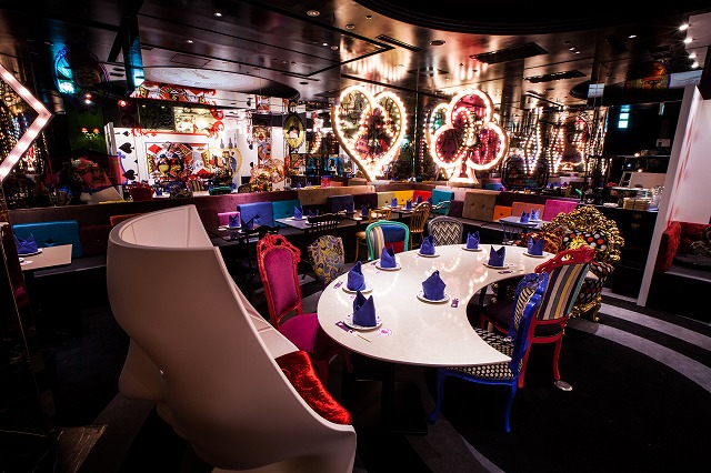 「ハートの女王」ご自慢のキラキラ光るトランプの鏡や色とりどりの玉座が並ぶオープンフロア、「いかれ帽子のマッドハッター」がバターやジャムを塗って壊してしまったハチャメチャな時を刻む時計に囲まれたボックスシート、「トランプ兵」がドリンクミーを飲んで大きくなりすぎてしまった半個室席など、へんてこで魅力的な住人をモチーフにしたお席たちがあなたの来国を心待ちにしています!