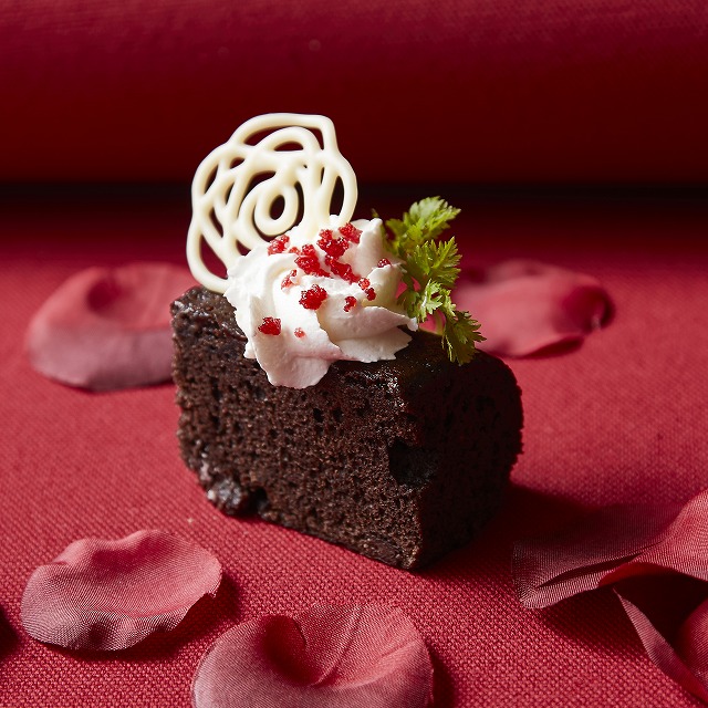 しっとり濃厚なブラウニーの上に、より甘さを引き立たせるホイップをトッピング。白い薔薇に手を伸ばすときはハートの女王の視線にご用心を。