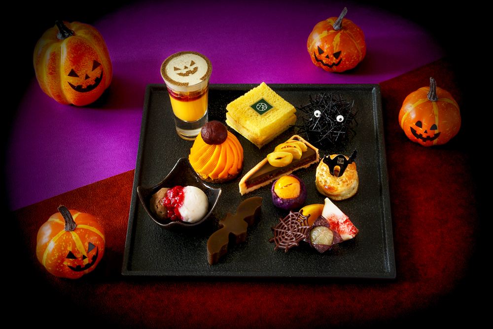 ハロウィン限定のアフタヌーンティー 初登場!カボチャやほうじ茶を使ったスイーツ ハロウィンモチーフに変身 コウモリをかたどったほうじ茶の羊羹や、おばけをイメージしたイカ墨のセイボリーなど