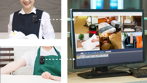 遠隔から客室、スタッフへ指示:オフィスからマネージャーが映像や音声をリアルタイムで確認。万が一の場合の緊急連絡や、忘れ物があった場合の対応を指示。新人教育にも活用する事ができます。
