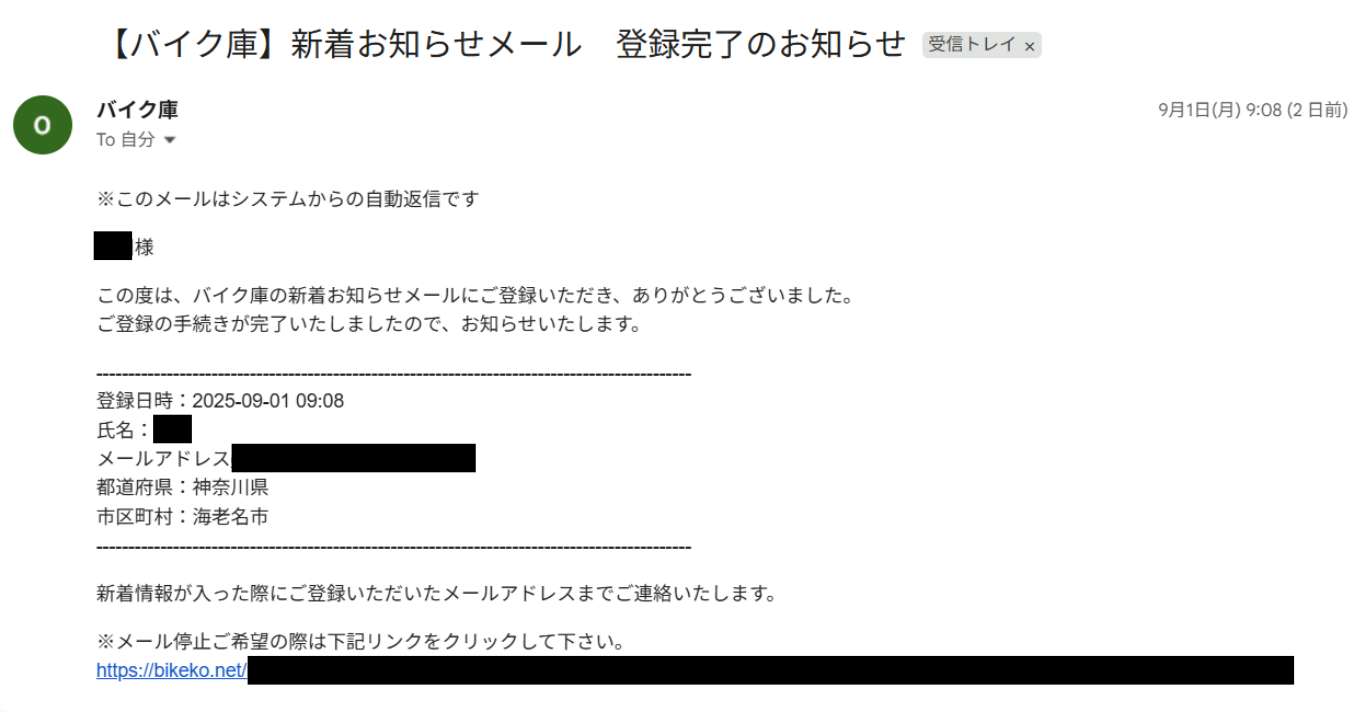 バイク庫のサイトTOPにある「新着情報をメールで受け取る」のボタンから登録ができます。
