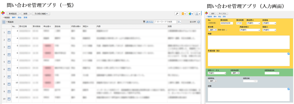 「問い合わせ管理アプリ」は、対応履歴一覧を作成し分類ごとに表示させることや、複数の職員が同時に編集作業を行うことができます。