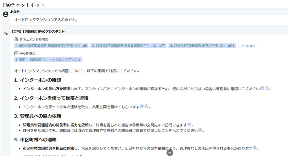 これまで神奈川県統計センターの国勢調査に関する問い合わせ業務では、個々の担当者が様々な問い合わせに対し、国から提供されたマニュアル等を参照しながら個別に対応していました。この運用では、担当者スキルによる回答精度のばらつきや、同様の問い合わせに対して都度マニュアルを参照するといった作業の非効率性が課題となっていました。この課題を解決するため、神奈川県統計センターは「AppSuite」で問い合わせ管理アプリや在庫管理アプリを構築し、業務プロセスを標準化。さらに「neoAI Chat」で複数の事務要領等を学習させた独自のチャットボットを活用することで、関係資料や専門知識を活用した生成AIによる回答が可能となり、担当者間の回答品質の均一化と、マニュアル参照作業の効率化を実現します。