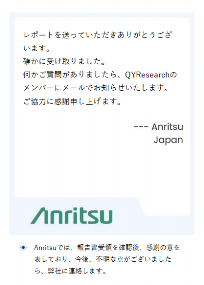 「レポートを送ってくれてありがとうございます。間違いなく受け取りました。また何か疑問点などが出てきましたら、QYResearchのメンバーにメールさせていただきます。ご協力ありがとうございました。」