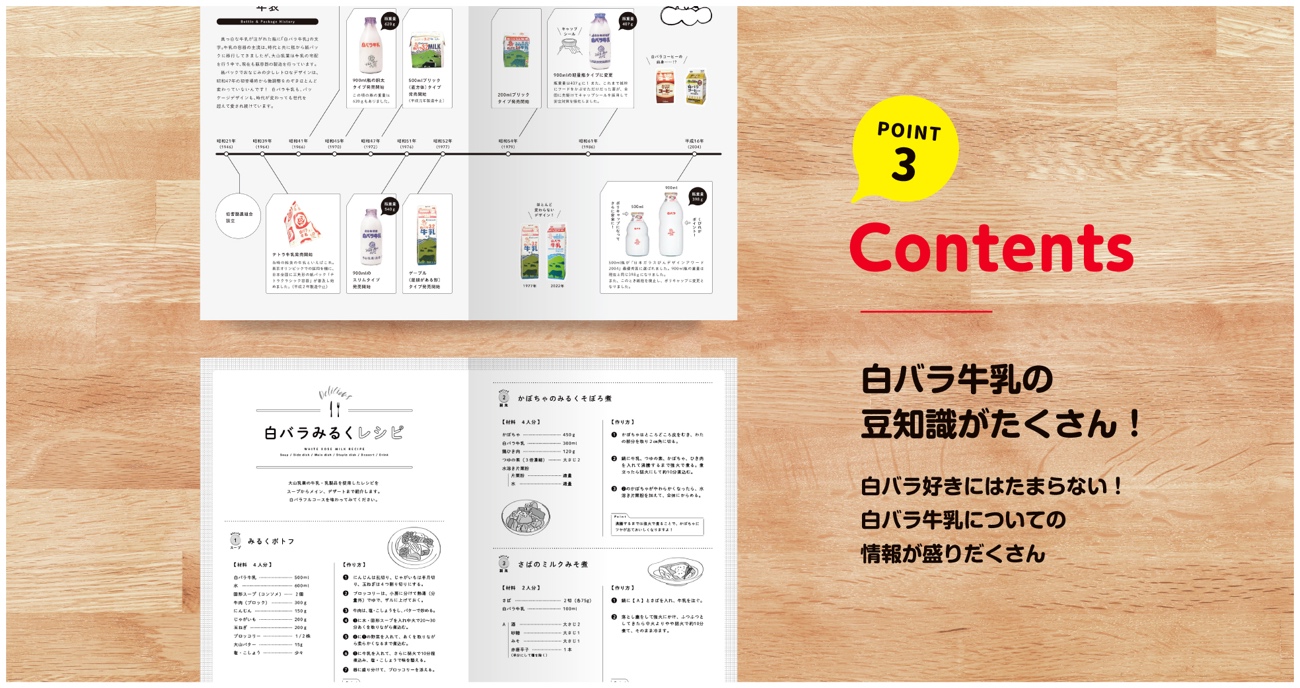 白バラ牛乳について学べる《モーっと知りたい白バラのこと》や、大山乳業の商品紹介、白バラフルコースを味わえるレシピなど、牛乳にまつわるトピックスを多数収録しています。