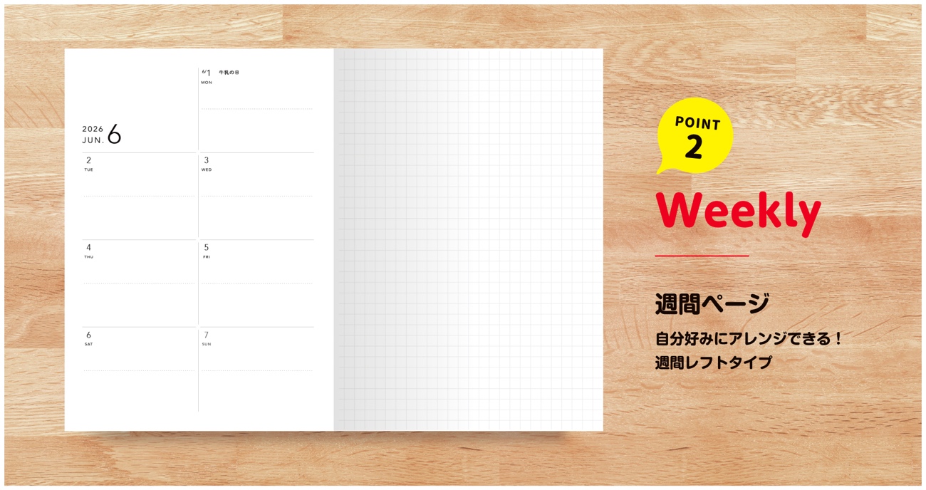 スケジュールパートはマンスリーに加え、週間の予定とメモがしっかり書き込める週間レフトタイプを採用。