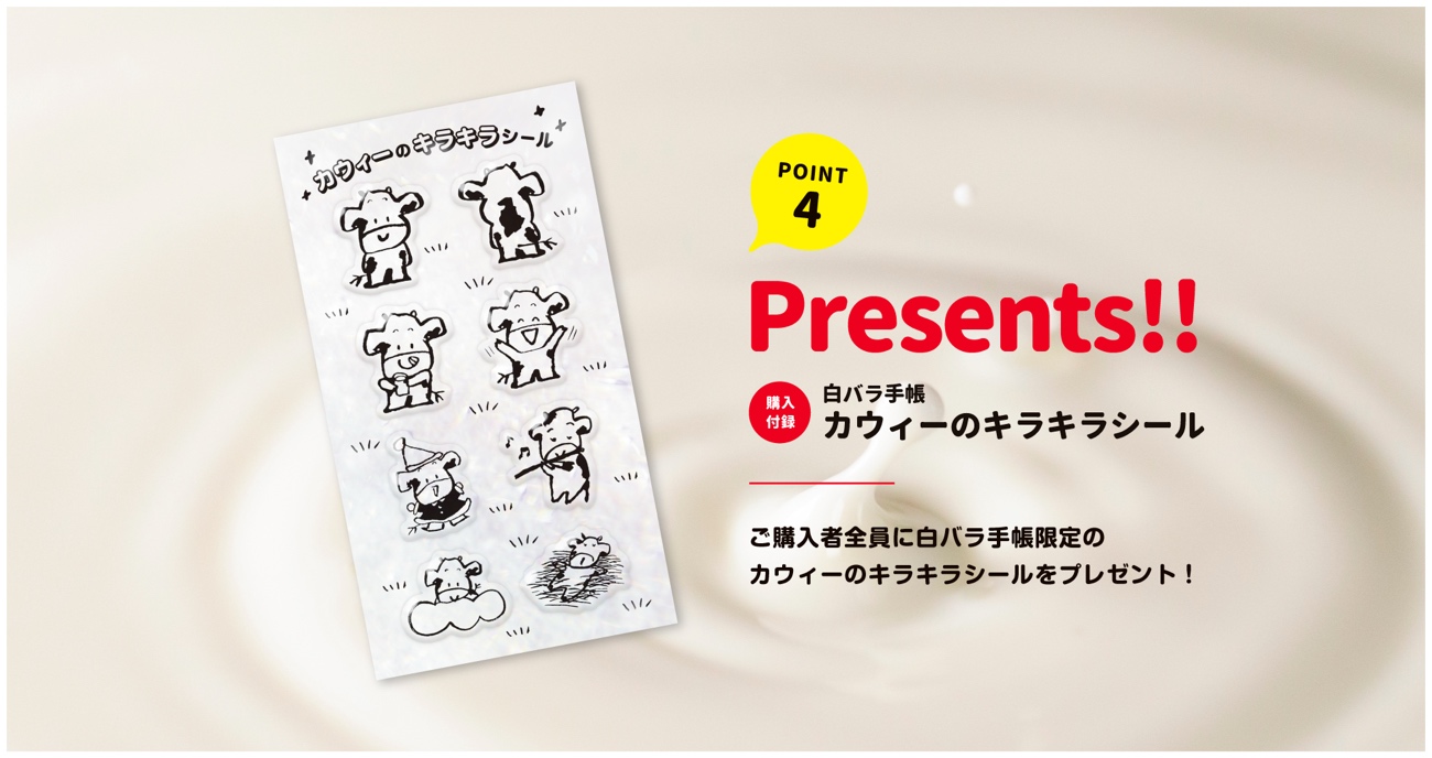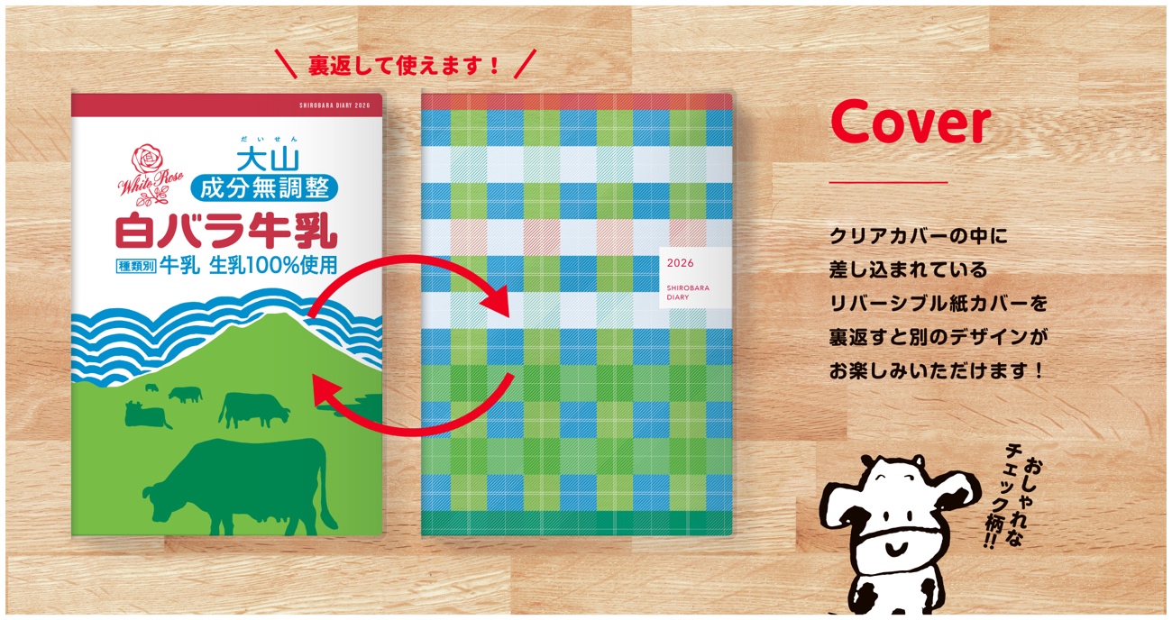 リバーシブルの表紙に加え、月間・週間レフト式で予定管理もメモも使いやすい構成。さらに「白バラ牛乳」についての読み物やレシピも収録した、実用性と楽しさを兼ね備えた一冊です。