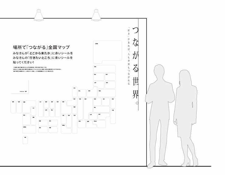 大きな全国地図に「どこから会場に来たか」「次どこに行きたいか」をシールで貼っていくことで、様々な地域に思いを馳せる機会となるほか、会場にいる人同士のつながりも感じられます。