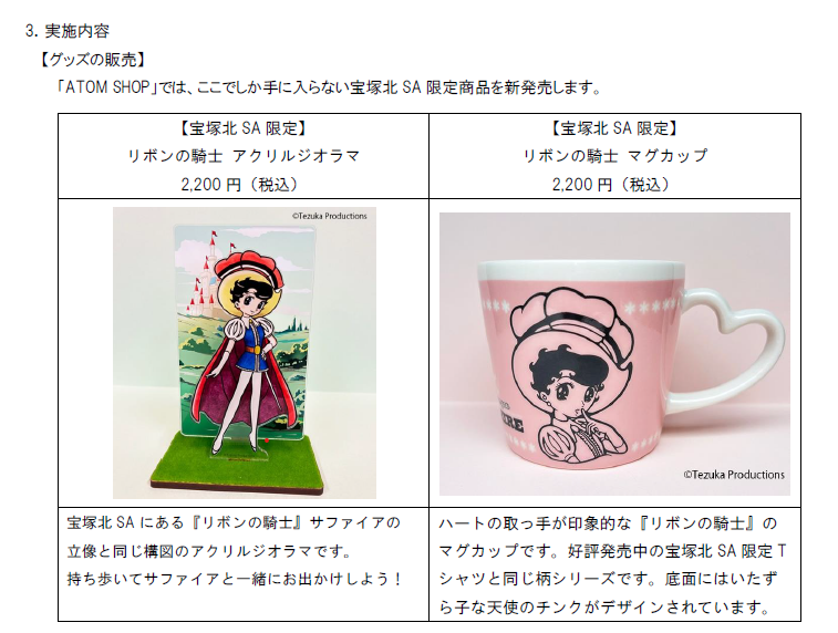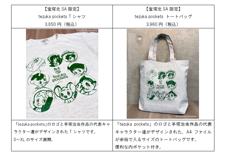 『鉄腕アトム』、『ブラック・ジャック』などのキャラクターグッズや宝塚北SA 限定グッズを販売するほか、複製原画のミニ展示やアトムの等身大パネルの設置など、ファンにはたまらない内容が盛り沢山となっております。