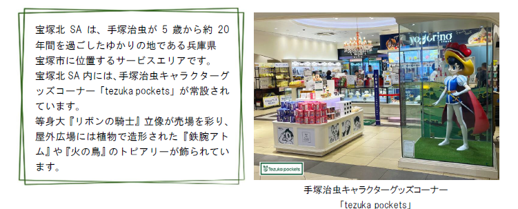 また、宝塚市立手塚治虫記念館(兵庫県宝塚市)で配布するチラシを宝塚北SA ショッピングコーナーにお持ちのうえお会計時にご提示いただくと、手塚治虫キャラクターグッズを含む1,000 円(税込)以上お買い上げのお客さまを対象に、お会計金額より100 円割引いたします。