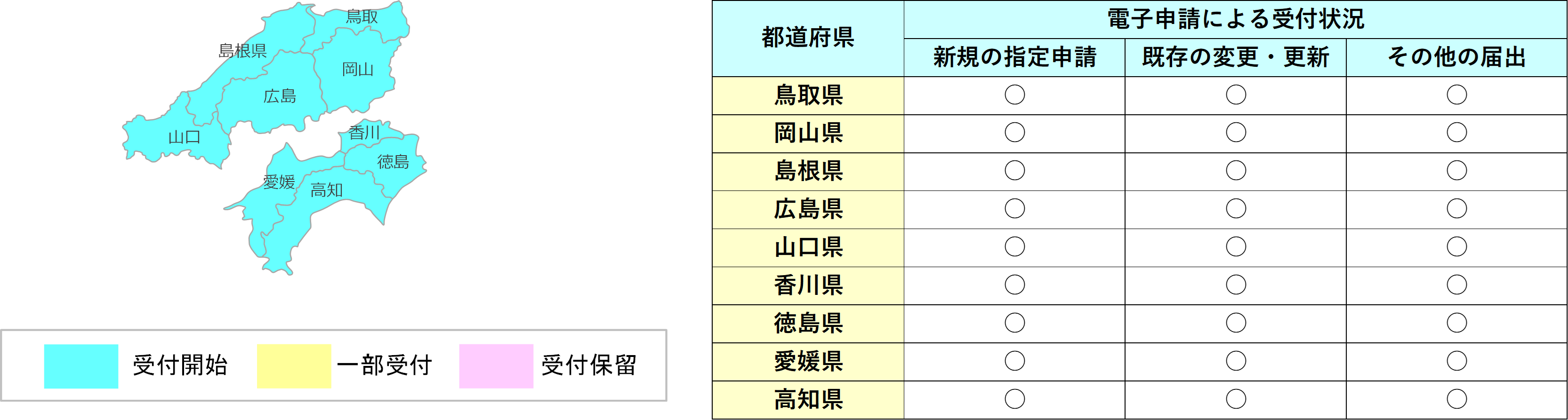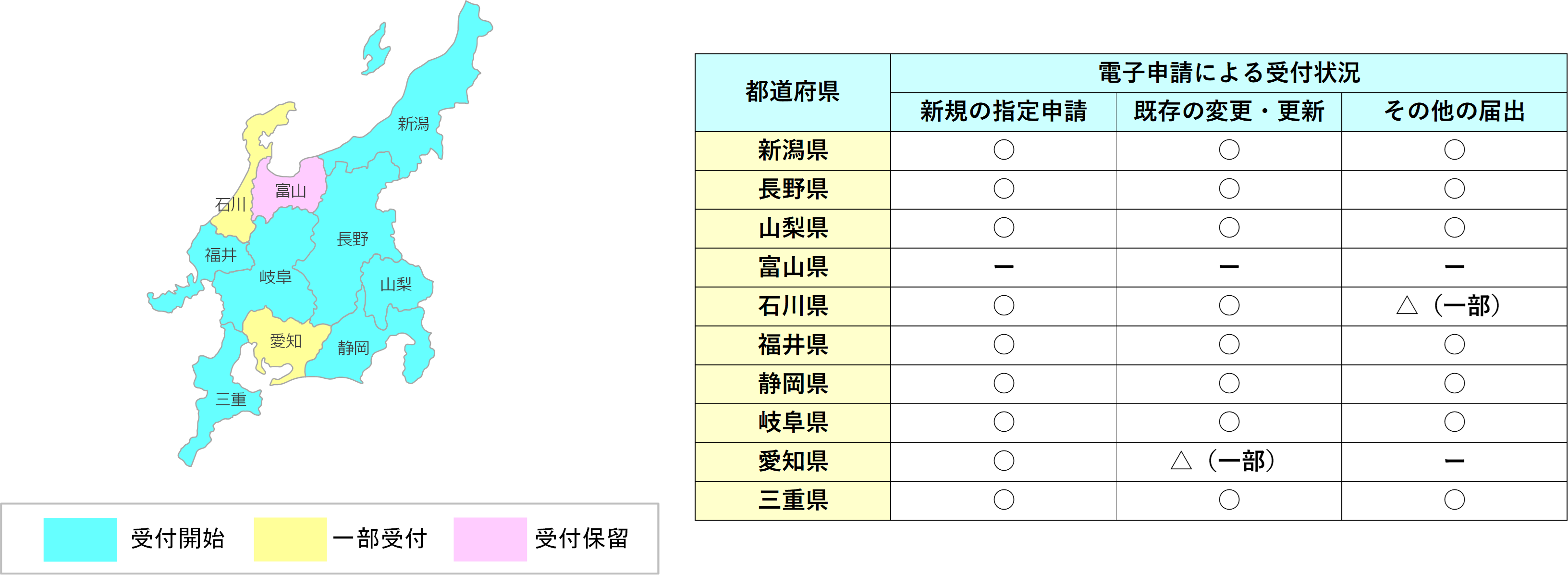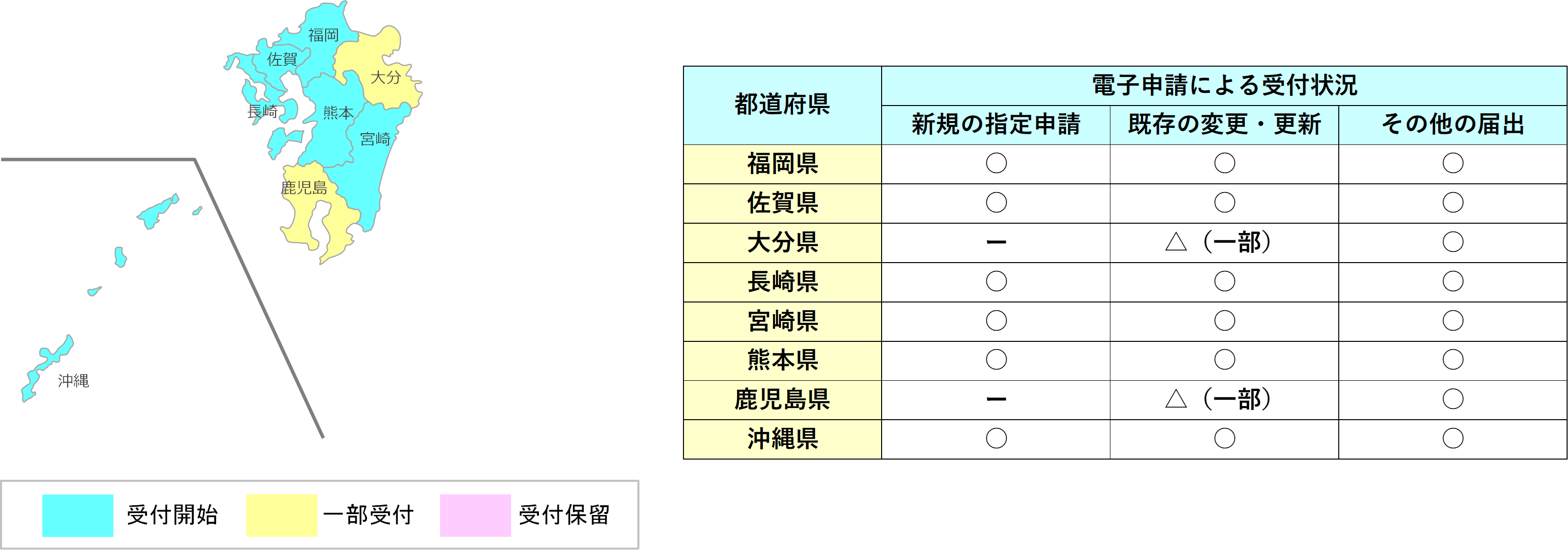 ・広範囲で電子申請での手続きが広まっていますが、大分県と鹿児島県では、申請時に手数料を徴収する関係で、新規の指定申請と既存の更新申請が受付保留となっています。