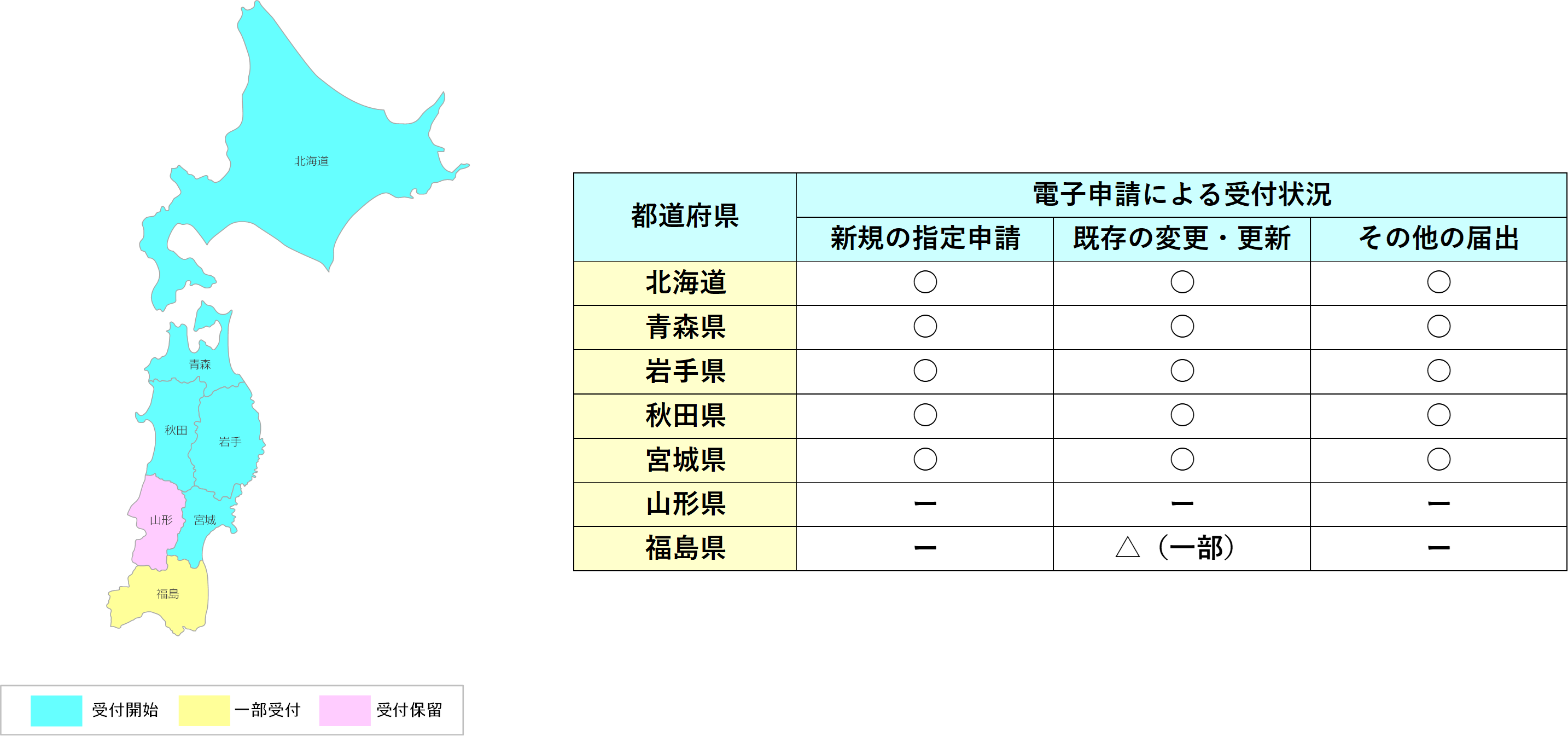 ・福島県での受付状況は、既存の変更届出のみになりますが、この他の申請・届出についても、順次、追加される予定です。