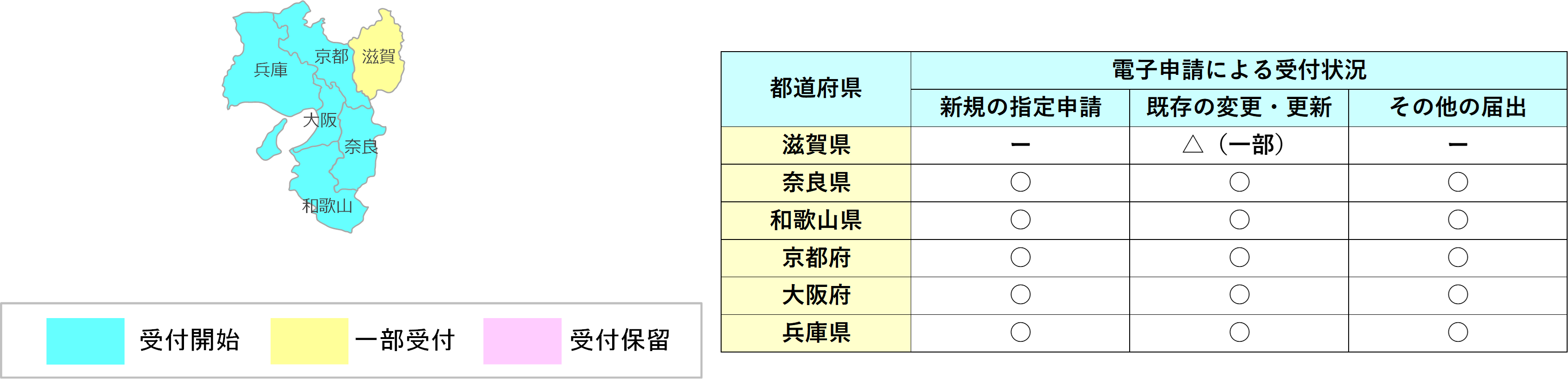 ・滋賀県での電子申請の受付は、既存の変更届出、休止・廃止届出、再開届となり、その他は順次の予定となっています。
