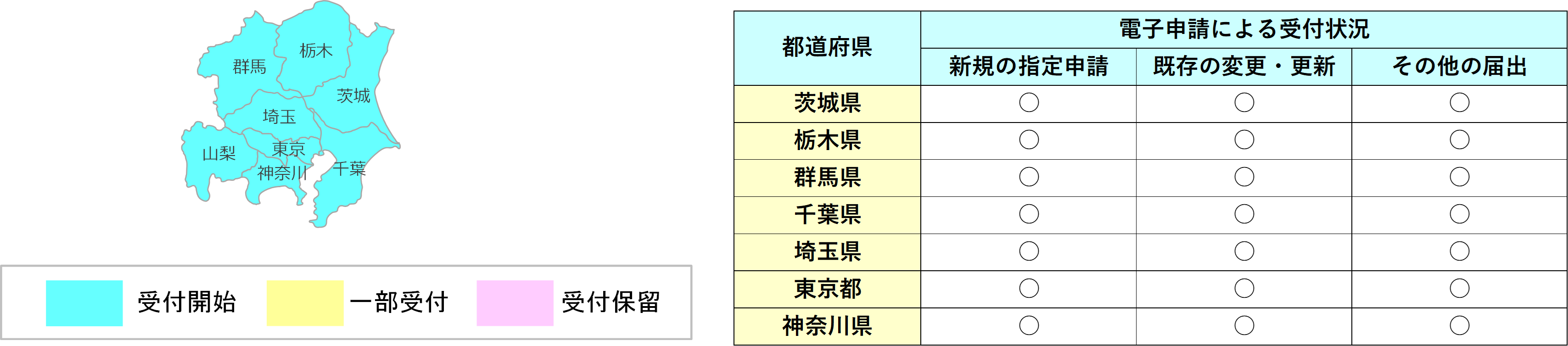 現状の受付状況は、多数の都道府県で電子申請は既に開始されており、若干の都道府県や申請内容で、受付が一部/保留になっていますが、今年度中に電子申請での受付が予定されています。