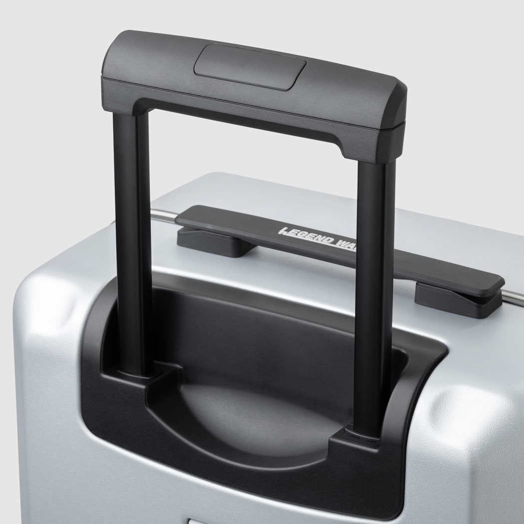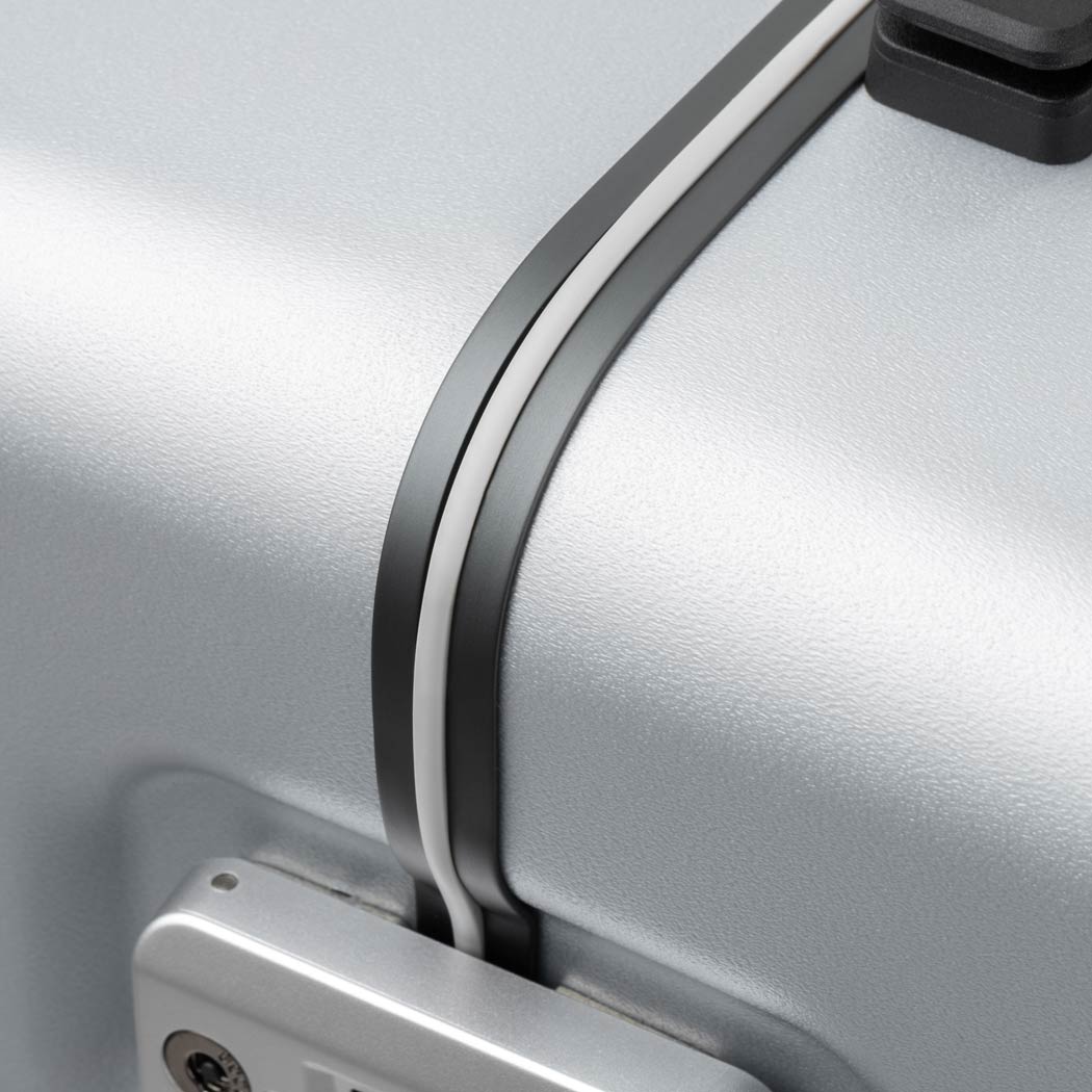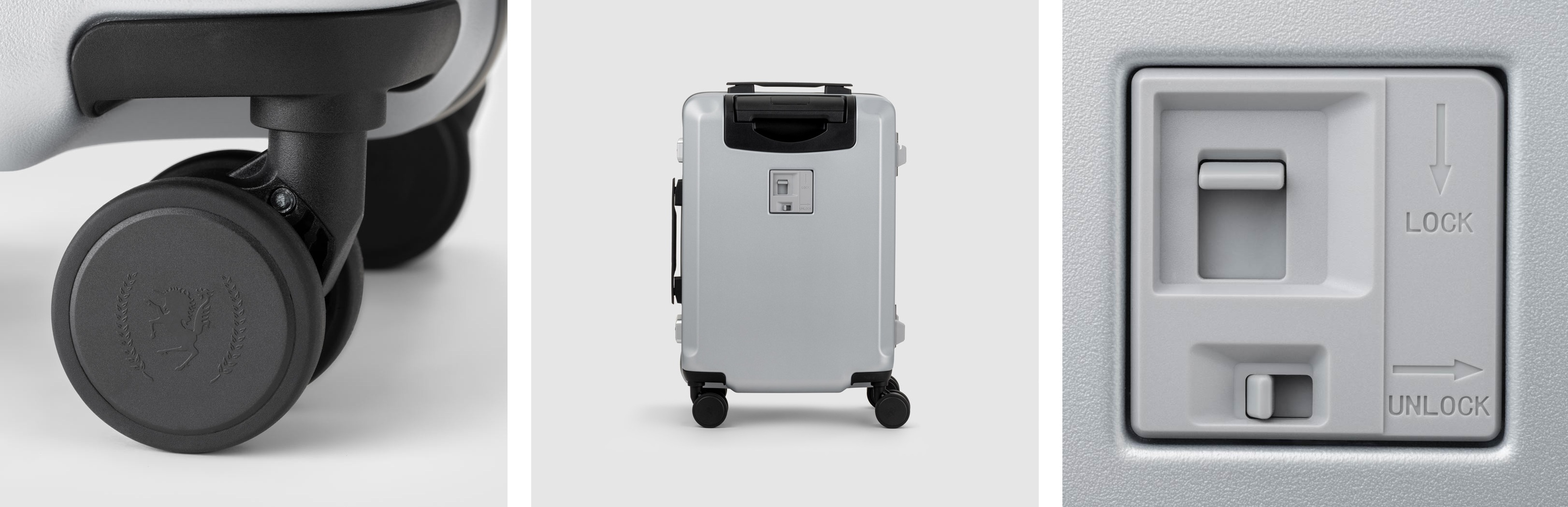 ベアリング内蔵による、静音性・走行性に長けた独自開発クッションキャスター。スーツケース背面のレバー操作によるストッパー機能付きで、公共交通機関での移動時も安全。