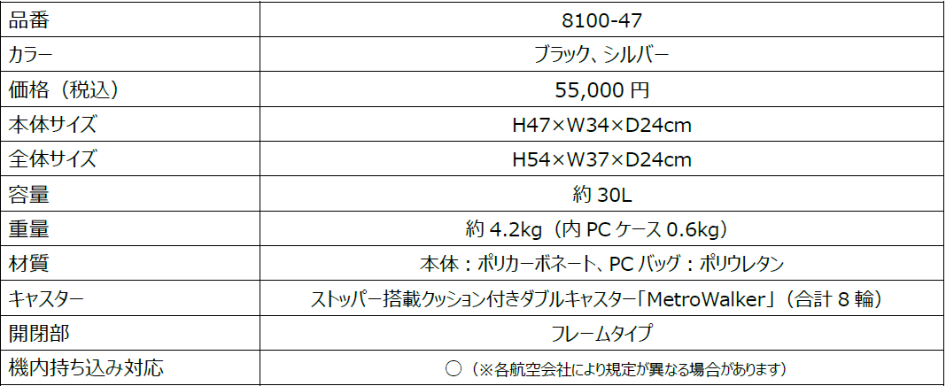 ビスを排したアルミ製のシームレスフレームや、ブランド初のダブルカラーハンドルに加え、初採用の強力マグネットバックル「LinkOn(リンクオン)」による脱着式フロントPCケース、高い静音性と滑らかな走行性を誇る独自開発クッションキャスター「FlexWalker(フレックスウォーカー)」を進化させた最新型のストッパー搭載クッション付きダブルキャスター「MetroWalker(メトロウォーカー)」など、都市での移動を支える新機能を随所に搭載しました。
