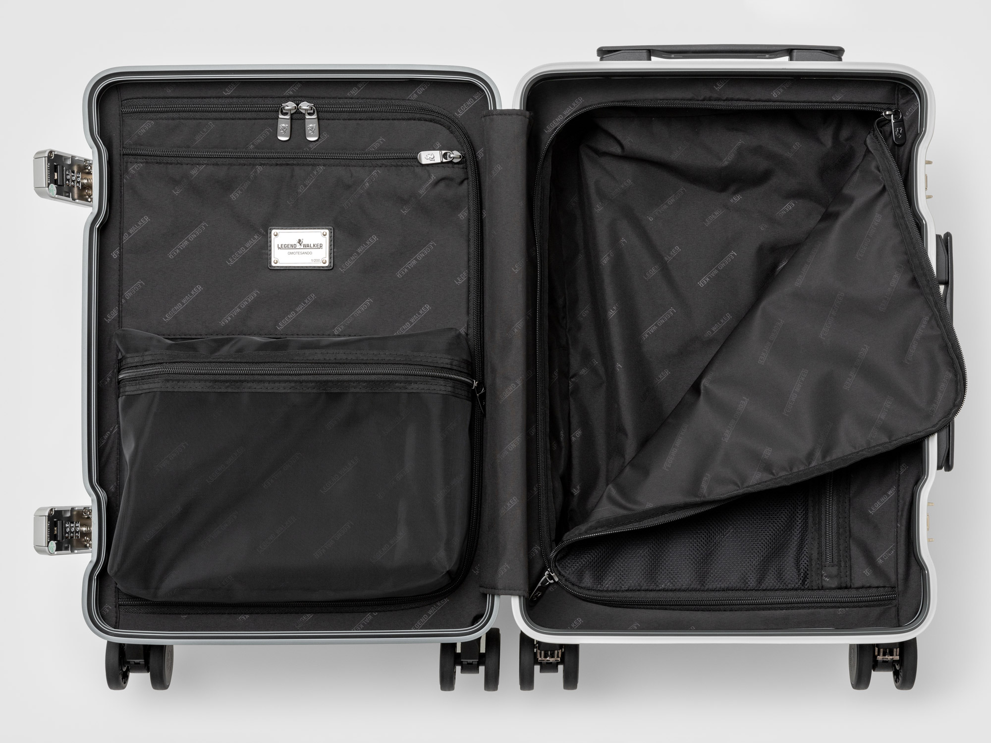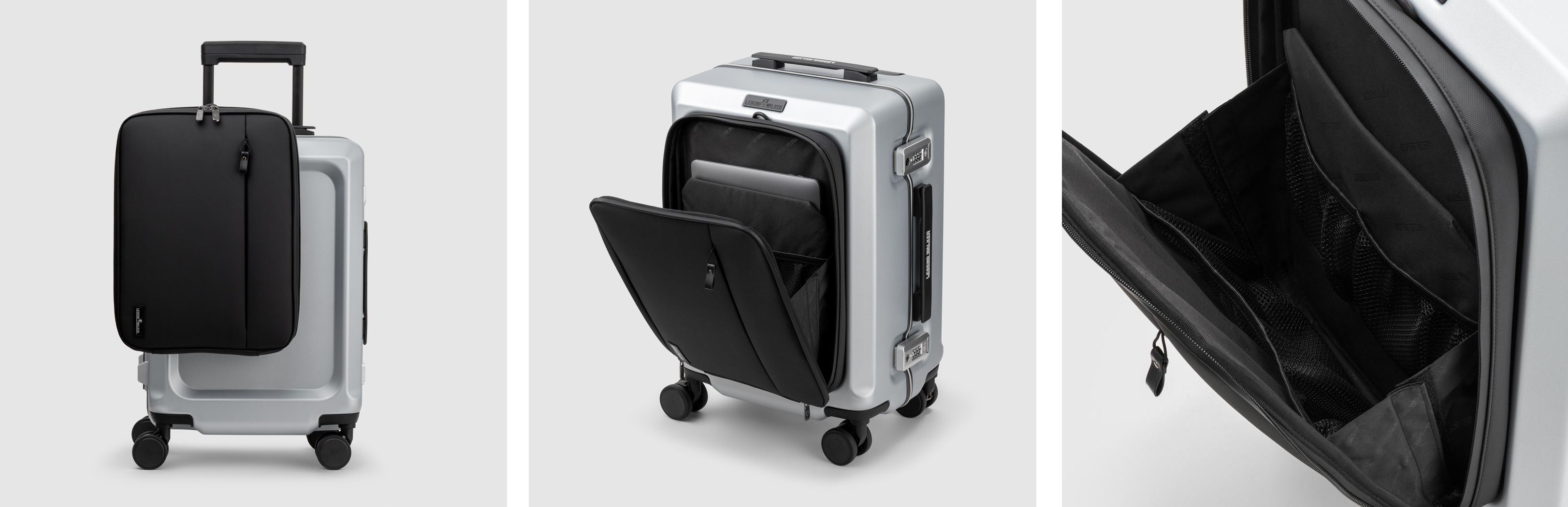 スーツケースのフロント部分に、マグネットバックルで簡単に着脱できる専用PCバッグ付き。必要なときだけ、スマートに持ち運べる新発想。13インチまでのノートPCやタブレット、A4ファイル、小物などの収納が可能です。ポリウレタン素材と止水ファスナーで水濡れに強く、内部にはPC専用スペースと小物収納ポケットを配置。