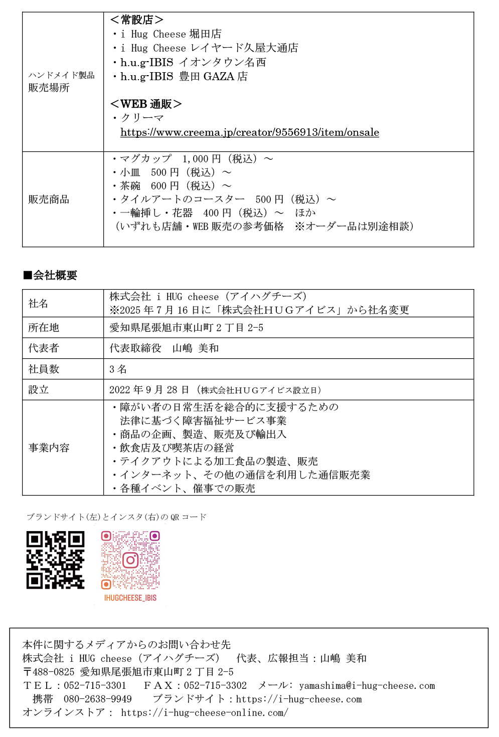 グルテンフリースイーツの開発・製造など、障がい者に施設外就労の場を提供している「株式会社 i HUG cheese(アイハグチーズ)※1」(所在地:愛知県尾張旭市 代表取締役:山嶋 美和)。名古屋市内にある「アイビス工房」(金山、菊井の2拠点)では、障がい者(以降、自社で呼ぶパートナーさんと表記)が陶器をはじめとしたハンドメイド品を制作・販売しており、中でも陶器製品は、手作りの味わいと使いやすさが国内客のほかインバウンド層の目にとまり、看板商品のスイーツとともに順調に売上を伸ばしています。