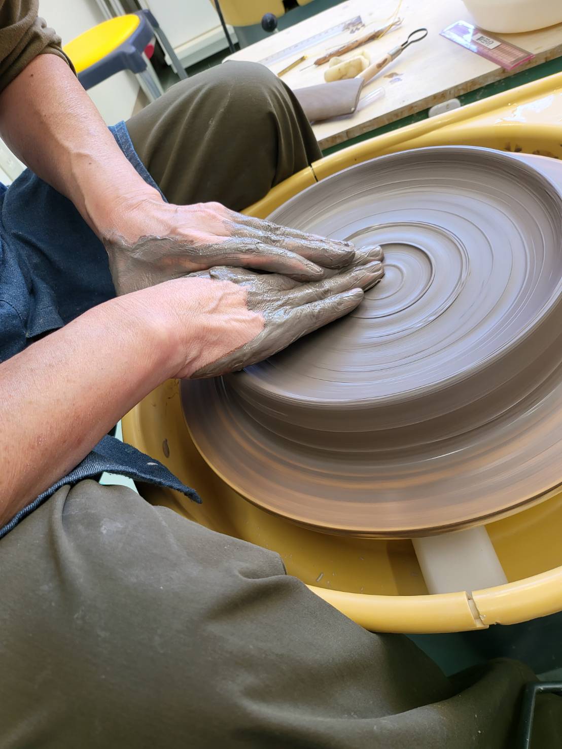 アイビス工房では、現役の陶芸作家として活躍する専門講師の手ほどきのもと、15名弱のパートナーさんが電動ろくろで