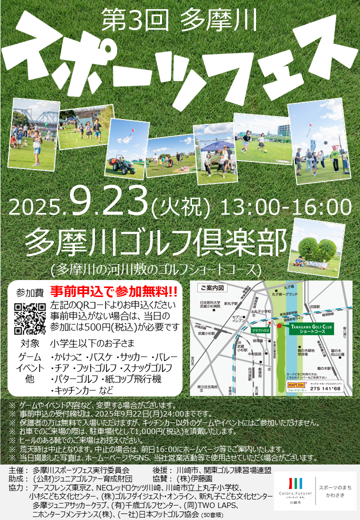 緑豊かな多摩川ゴルフ倶楽部が、9/23(火祝)に特別な姿を見せます。 普段はゴルファーが集う空間が、この日は子どもたちの歓声で溢れる、わくわくドキドキの遊び場に大変身します!!