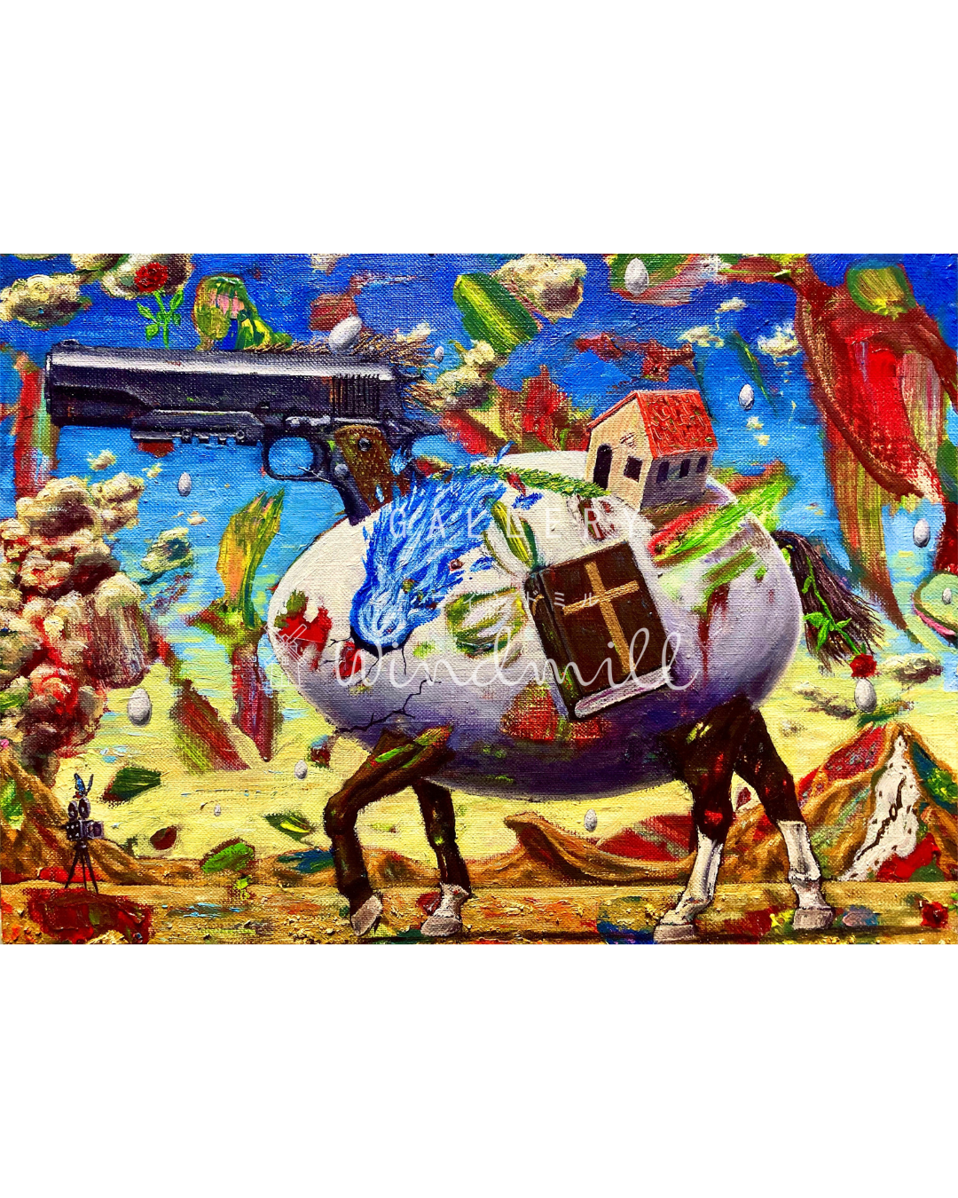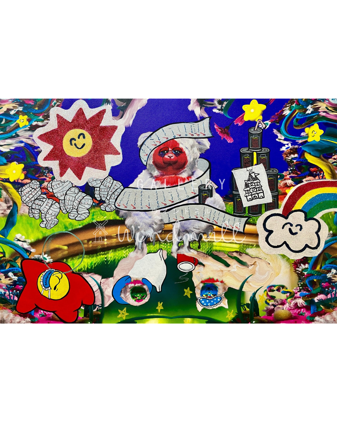 アーティストコメント:「二面性」をキーワードに、玩具などを用いて作られたジオラマ写真とキャラクターのアナログペインティングを 融合した作品や、スマートフォン用画像加工アプリを制作技法として加える作品などを主に制作し、幼児向けアニメのような 軽快かつ娯楽的な世界観を展開しています。