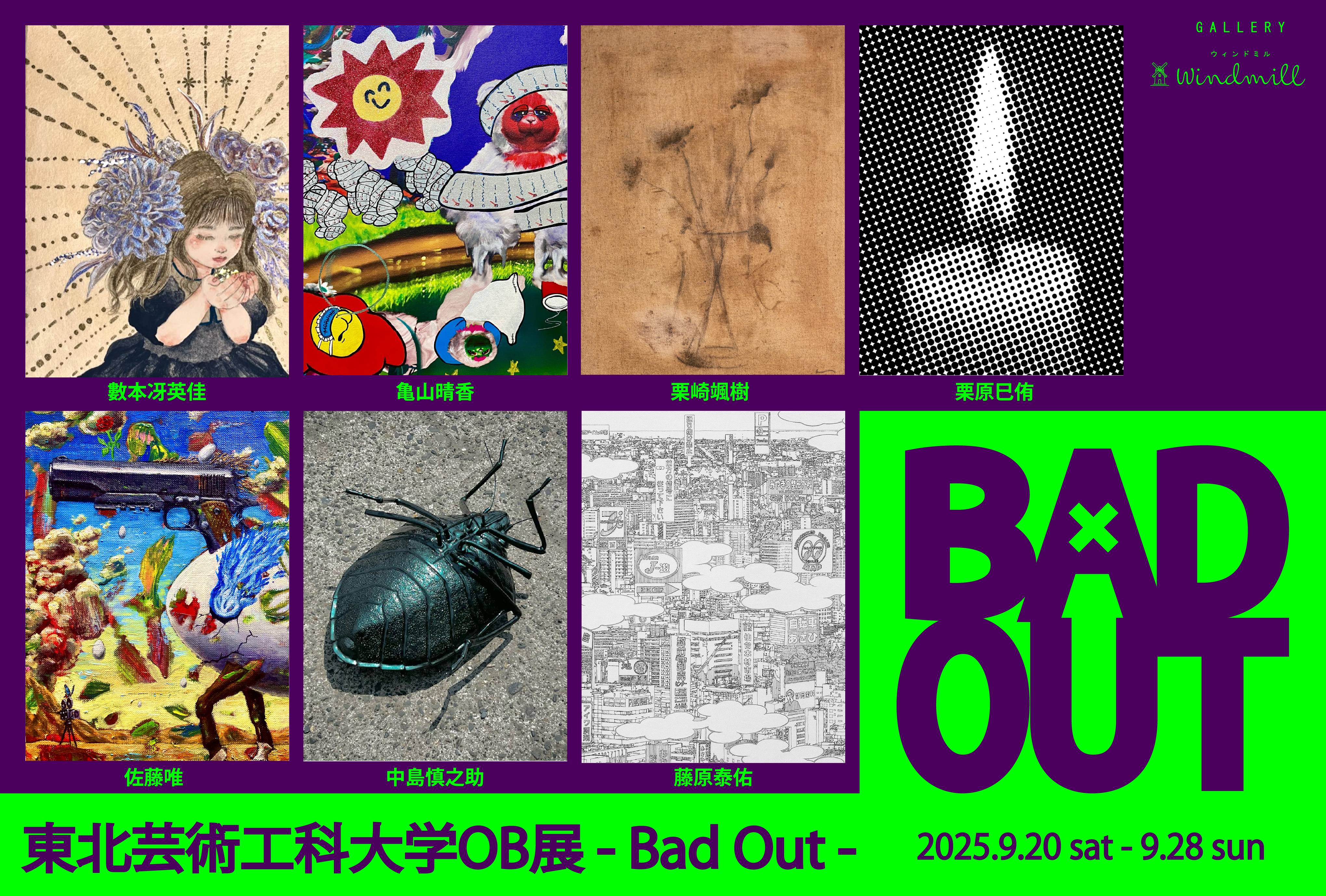 仙台市青葉区のGallery Windmillは、東北芸術工科大学(TUAD)の卒業生によるグループ展「BAD OUT」を、2025年9月20日(土)から28日(日)まで開催します。
