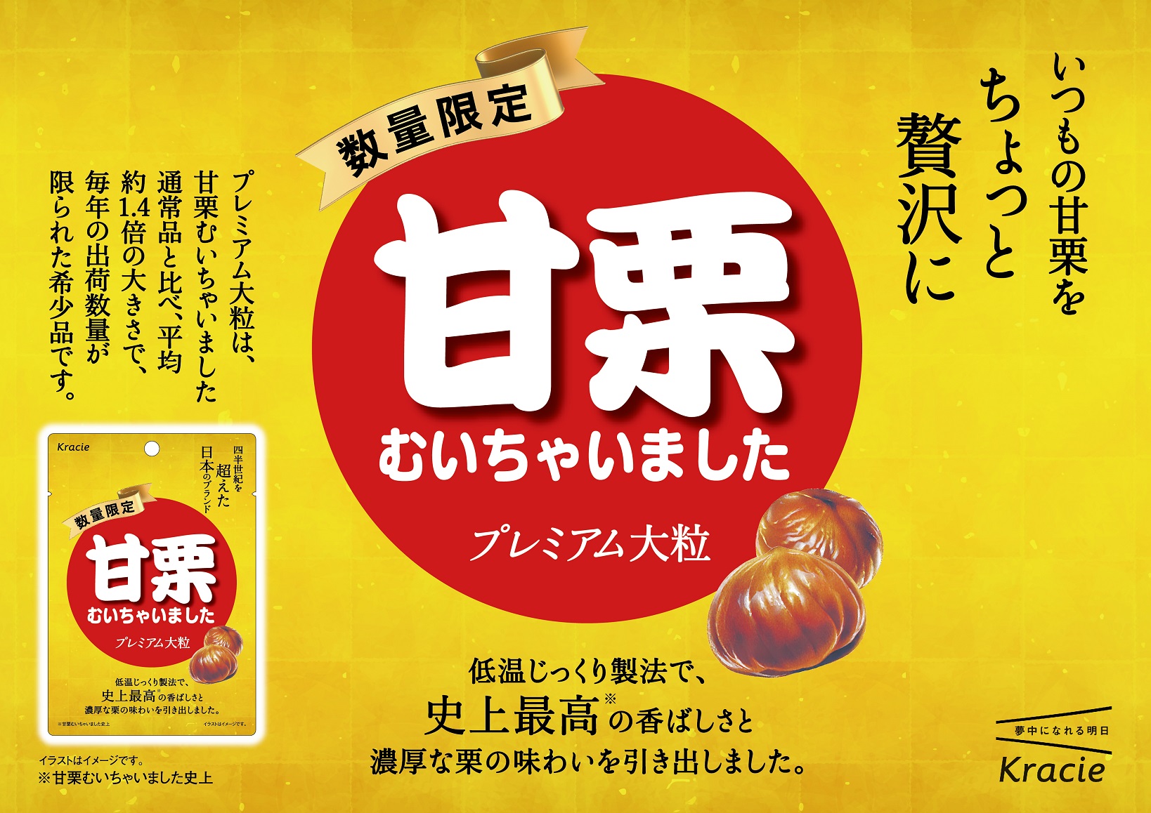 クラシエ株式会社(フーズカンパニー)は、1998年発売のロングセラー商品「甘栗むいちゃいました」から、希少な大粒栗を使用した「甘栗むいちゃいました プレミアム大粒」を2025年10月6日(月)より全国の一部企業店舗限定(コンビニエンスストアを除く)で販売いたします。