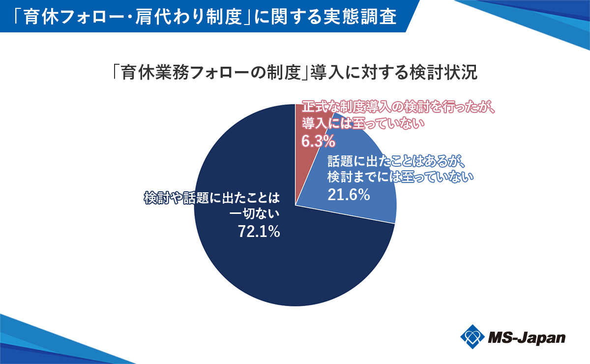 また、育休フォロー制度が未導入の企業での、「制度導入の検討状況」に関する調査では、「検討したことがある」企業が6.3%、「話題に出たことはあるが検討には至っていない」企業が21.6%と、制度の必要性に対する一定の関心がうかがえました。