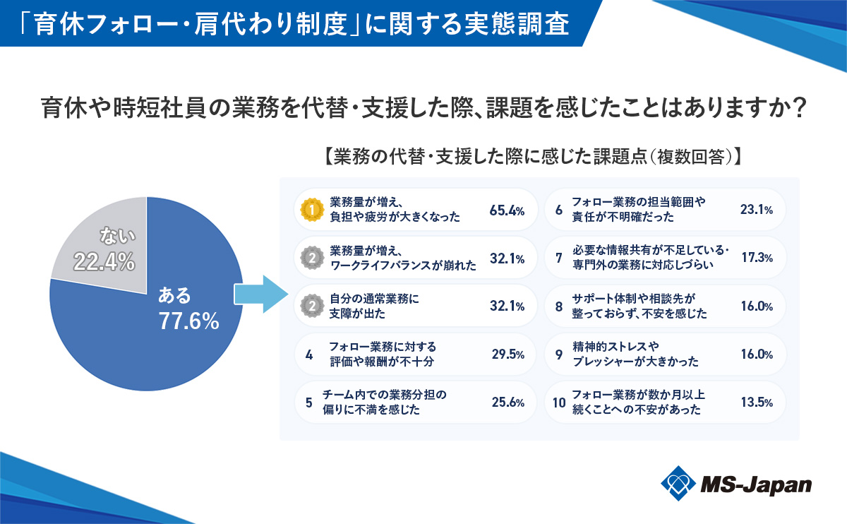 MS-Japanが「育休社員の肩代わり手当・制度」を調査。管理部門・士業の77.6%が業務代替に課題を感じる一方、制度・対応ありの企業は35.3%