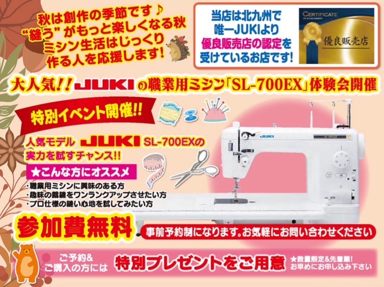 福岡県北九州市のミシン専門店「ミシン生活」では、創作の秋にぴったりの特別イベントとして、JUKIの大人気職業用ミシン「SL-700EX」の無料体験会を開催いたします。