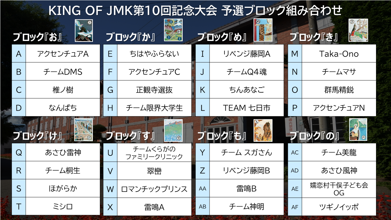 一般社団法人KING OF JMK(代表理事:渡邉 俊)は令和7年10月11日(土)に世界遺産:富岡製糸場 西置繭所 多目的ホールで『KING OF JMK 第10回記念大会~おとな達の上毛かるた世界一決定戦~』を開催致しますが、参加する32チームの予選ブロック組み合わせが決定致しましたのでお知らせします。世界初の、世界遺産で開催する上毛かるたの世界一決定戦です。当日は是非現地にお越しいただき、一緒に上毛かるたを盛り上げていただけると幸いです。