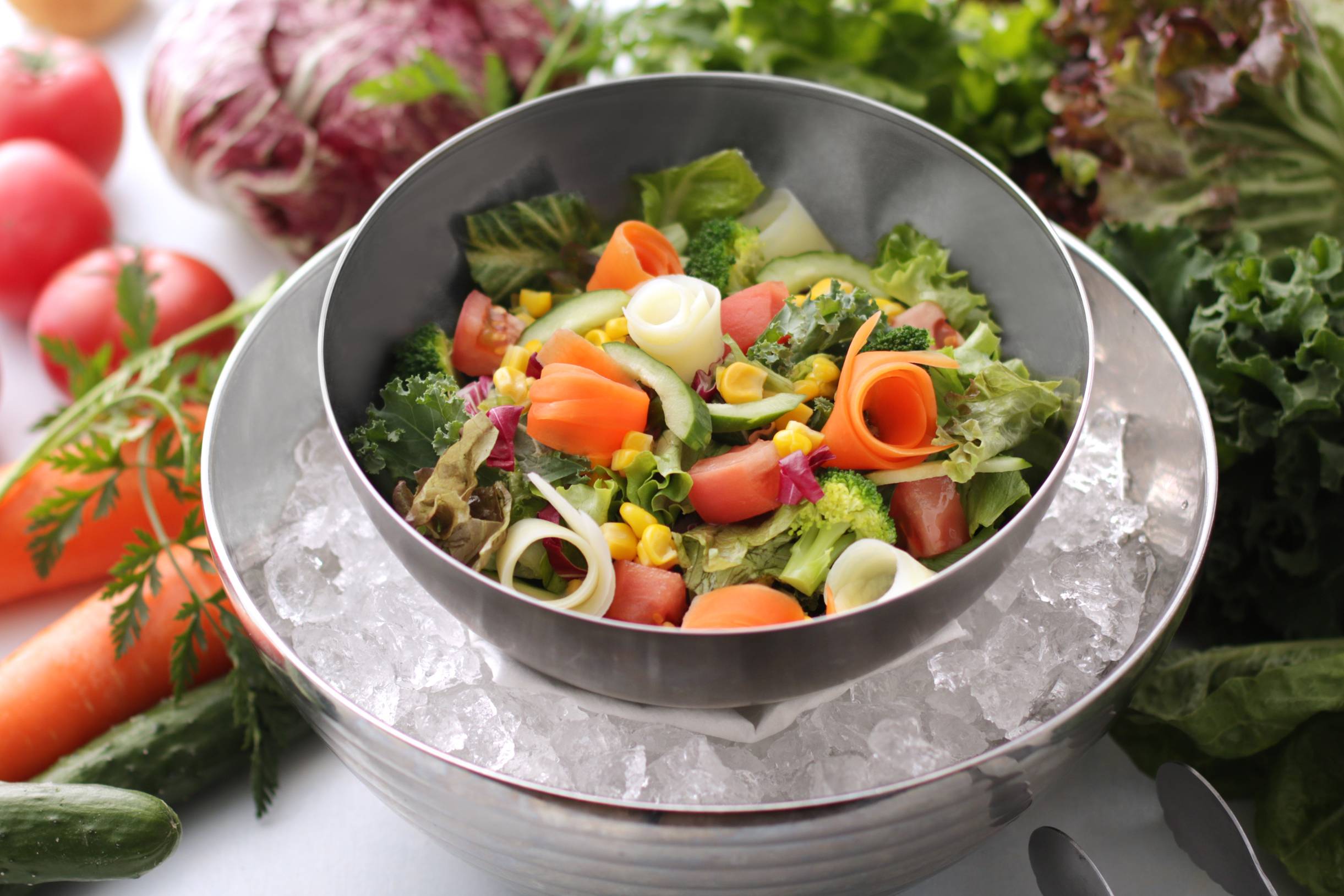 氷で冷やしながら提供するサラダは、最後まで冷たくシャキシャキの食感です。彩り豊かで見た目も華やかな